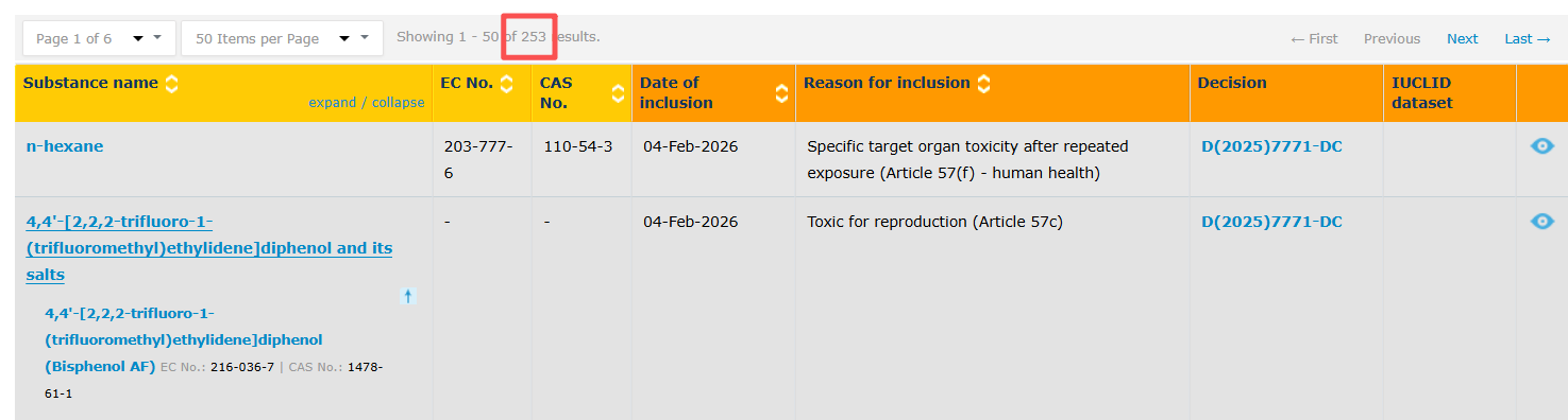 2026 年 2 月 4 日,欧洲化学品管理局(ECHA)正式更新了 REACH 法规下的高关注物质(SVHC)候选清单,新增 2 项物质,同时撤回 1 项原有物质,清单总数从 251 项更新至253 项,另有 1 项物质(间苯二酚)处于待定状态。